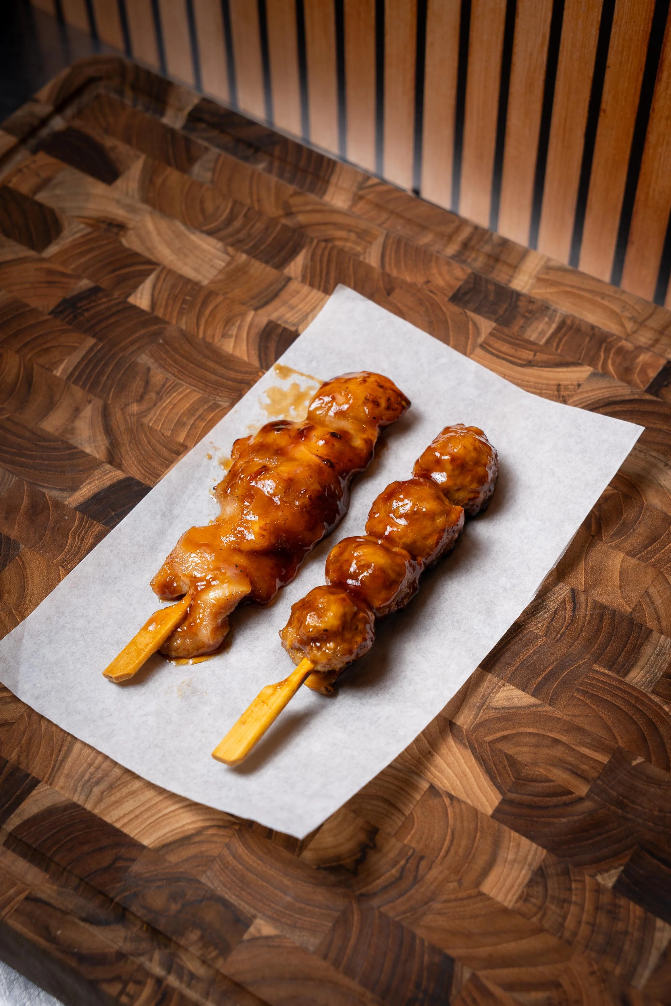 This yakitori set contains two skewers, seasoned with a sweet and savory sauce. One skewer of chicken thigh with green onion and the other skewer of chicken meat ball.